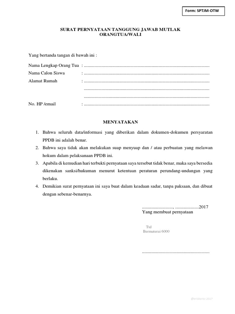 Surat Pernyataan Tanggung Jawab Mutlak Ppdb 2017