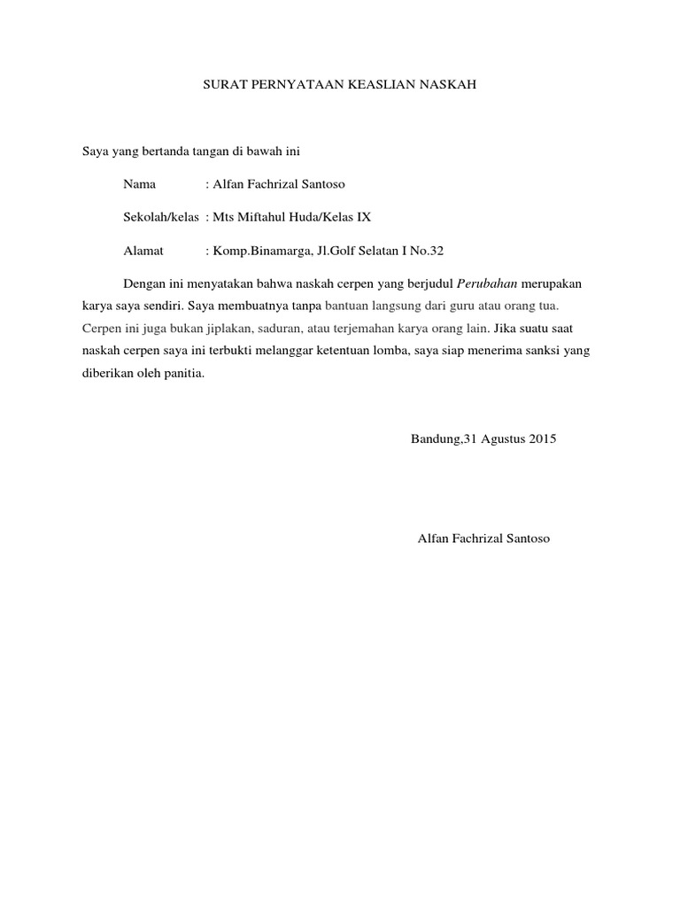 | Judul: Contoh Surat Pernyataan Keaslian Naskah Cerpen |